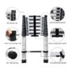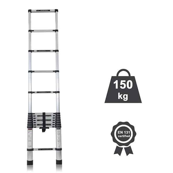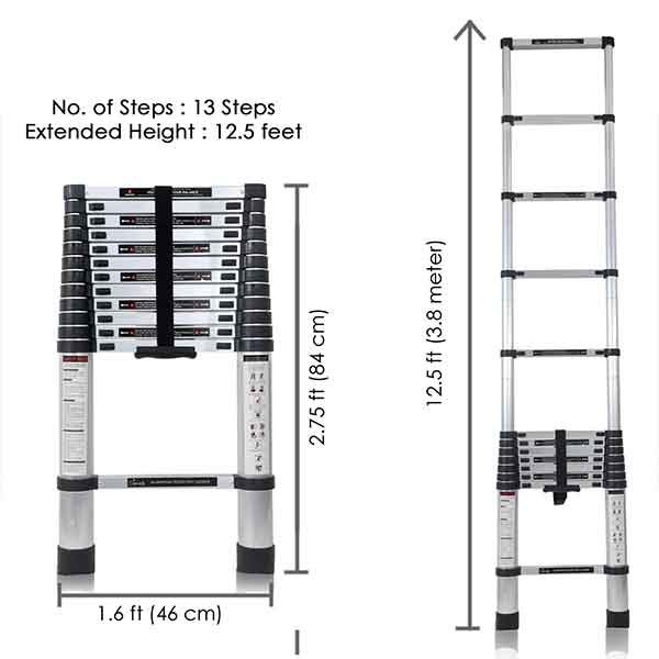 MADE TO LAST: Manufactured from corrosion-resistant quality aluminum alloy, it comes with a sturdy frame and anti-slip rungs for about 150kg weight capacity and it is also resistant to corrosion and any kind of rust. It has qualified and certified with EN131 for maximum safety, eco-friendly and maximum performance possible. Dimensions : Folded size 50 x 10 x 86 cm; Fully Extended length 3.8m (380 cm, 12.5 ft), Net weight: 10.2 Kg; 13-steps telescoping ladder.