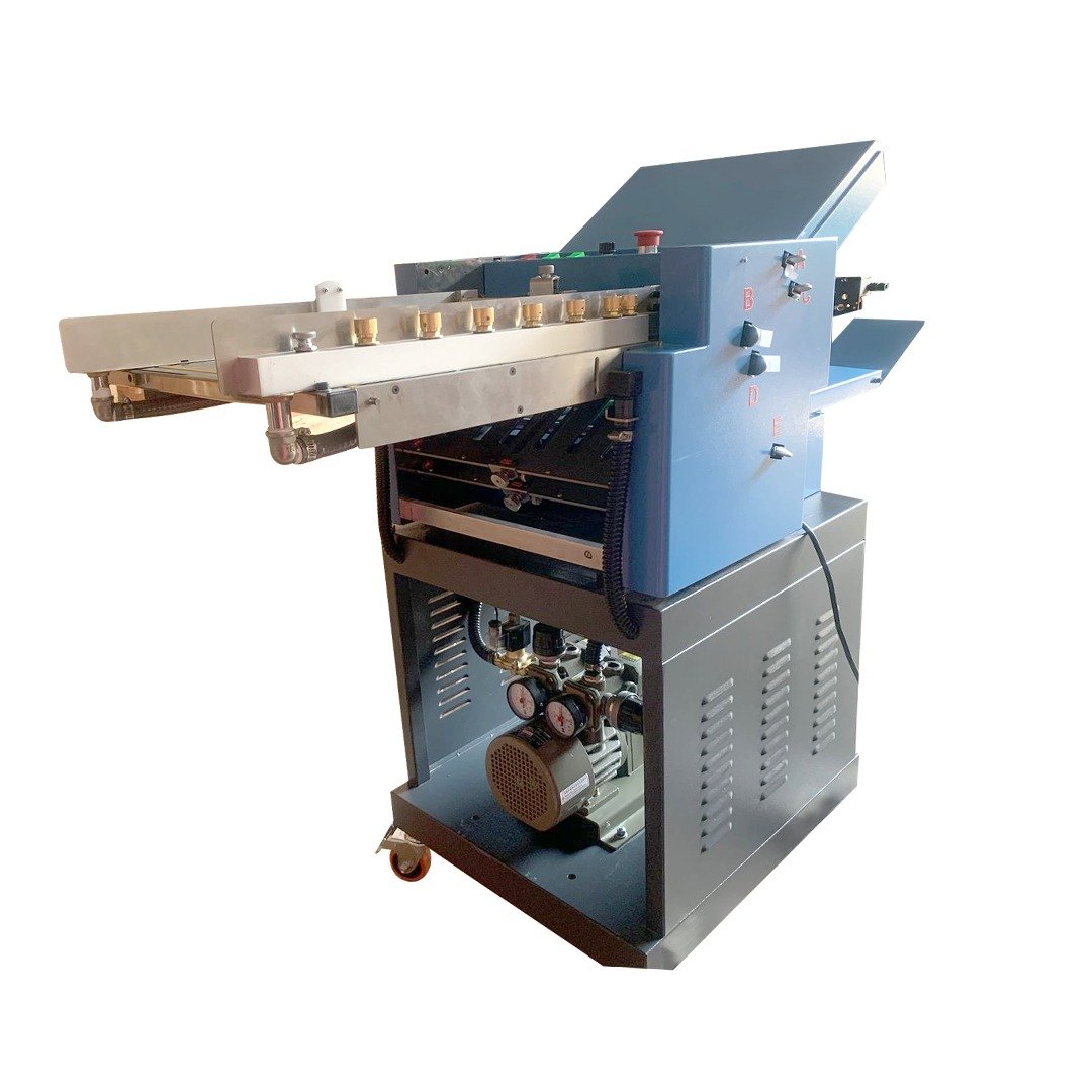 Namibind PFM 380B is a high-performance automatic paper folding machine, designed for commercial and office use. With 2 folding plates, it supports multiple folding styles, making it ideal for businesses, print shops, and organizations that require efficient and accurate document folding. This machine handles a maximum paper size of 380 × 520 mm and a minimum size of 90 × 120 mm, offering flexibility for different document sizes. It supports a paper thickness range of 50g to 240g, accommodating both lightweight and thicker paper types. The suction-type paper feed system ensures smooth operation, reducing paper jams and increasing efficiency. With an impressive folding speed of up to 29,000 sheets per hour (A4 size), the PFM 380B is built for high-volume folding tasks. It features a rear stop gauge adjustment offset for precise folding alignment and an adjustable speed receiving table to optimize workflow. Powered by a 1.5 kW motor and operating on a 220V, 50Hz/60Hz power supply, this machine is both powerful and energy-efficient. Its compact size (1530 × 580 × 1280 mm) and sturdy 138 kg build ensure durability and long-term reliability. Ideal for folding brochures, invoices, statements, and other business documents, the Namibind PFM 380B is an excellent solution for high-speed, high-precision paper folding. The wear-resistant helical gear system ensures smooth, quiet operation, making it perfect for professional document processing environments.
