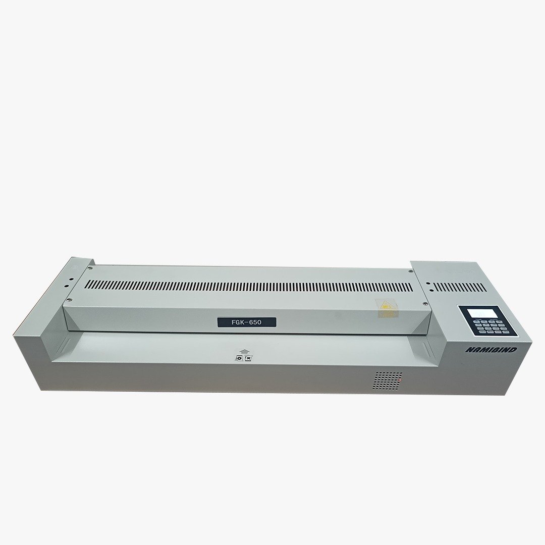 Namibind FGK-650 Heavy Duty 650 mm Document Laminating Machine, 2 mm Max Thickness, Infrared & Dual Heating, With 4 Silicon Rollers, Adjustable Speed for Professional Use Namibind FGK-650 Pouch Laminating Machine is a powerful, high-performance laminator designed for professionals seeking efficient and versatile laminating solutions. With a wide laminating width of up to 650 mm and a thickness capacity of 2 mm, this machine accommodates a variety of documents and materials, making it ideal for offices, schools, and print shops. The FGK-650 offers a customizable laminating speed ranging from 500 to 3000 mm/min, allowing users to adjust based on project requirements. Equipped with four high-quality rollers (diameters 44.2 mm & 44.7 mm), this machine provides smooth, bubble-free lamination. It features a dual heating system combining infrared, hot plate, and dual heating methods, ensuring consistent results across a wide temperature range of 80-180℃. The power-efficient 1150W motor is compatible with both 110/120V and 220-240V power supplies, enhancing its adaptability in different environments. Built with durability in mind, the FGK-650 has a compact design measuring 859*253*135 mm and weighing 40 kg, making it sturdy yet manageable in most professional settings.