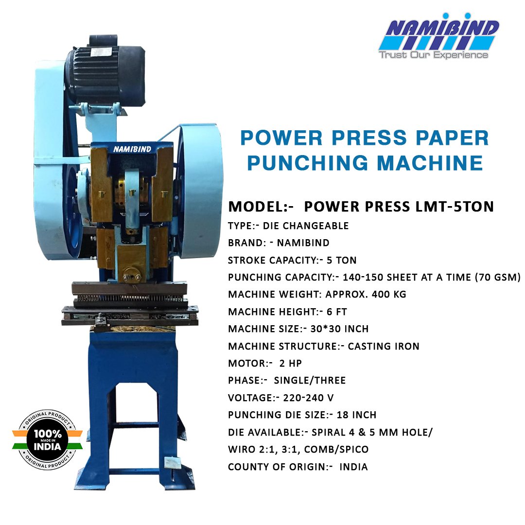 Namibind Power Press LMT-5Ton punching machine offers high-volume punching capacity, die-changeable features, and durable construction. It is ideal for industrial printing, binding, and packaging applications. The Namibind Power Press LMT-5Ton is a heavy-duty punching machine designed for high-volume applications. With a 5-ton stroke capacity and 140-150 sheet punching capacity (70 GSM), this machine is perfect for industrial-scale printing, and binding.