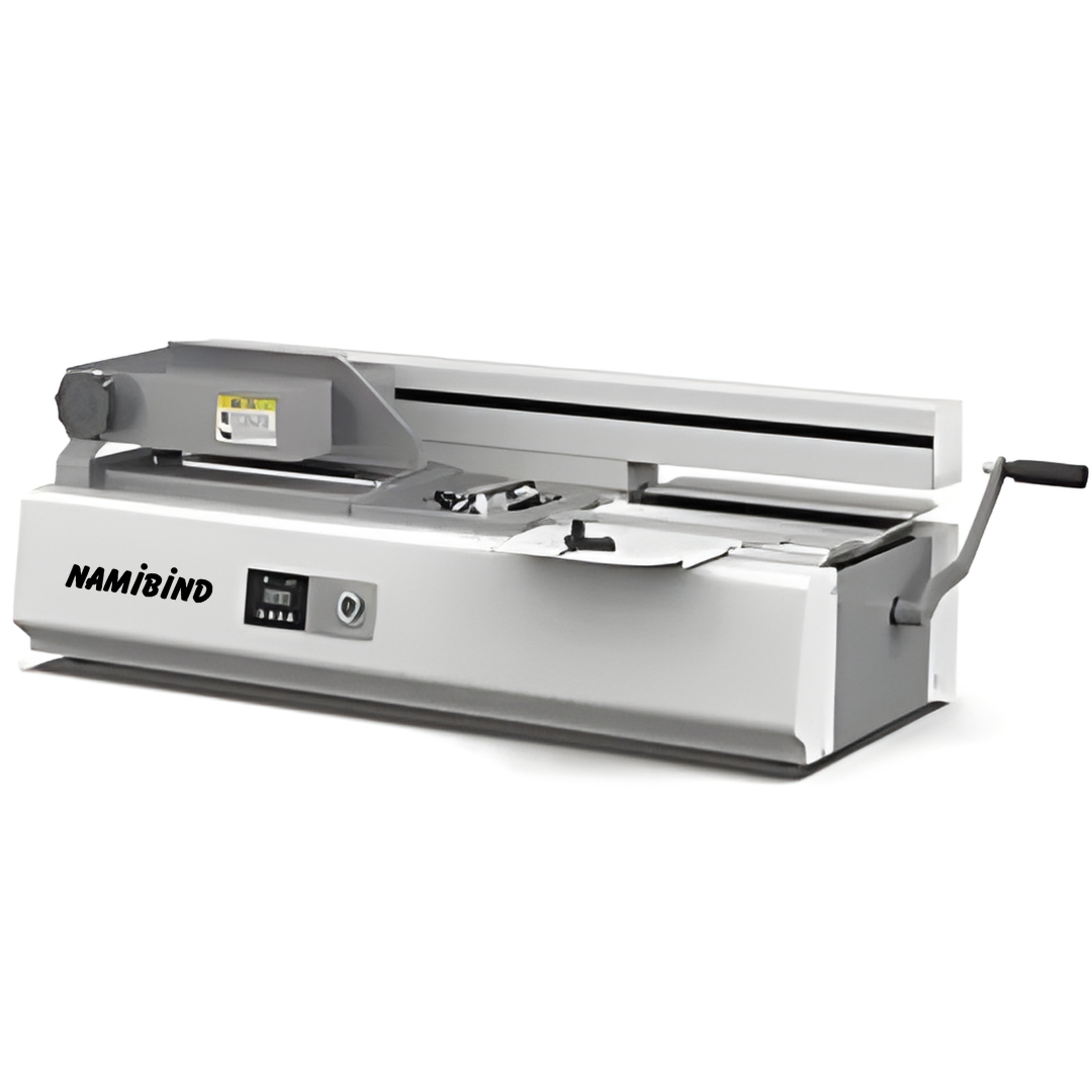 Namibind ZX-400 SA is a semi-automatic desktop glue binding machine designed for efficient and compact bookbinding. It boasts a binding speed of 150 books per hour, making it suitable for moderate-volume production. This machine handles a maximum binding length of 320 mm (A4) and a binding thickness of 30-40 mm, with a maximum book thickness of 3 2mm. Key features include manual clamping for both the book and cover, a beeline slippage type for precise alignment, and a small milling cutter for spine preparation. The glue melt time is approximately 25 minutes, and the machine operates on a standard 220 V/50Hz power supply with a power consumption of 650 W. Weighing 48 kg, Namibind ZX-400 DA offers a balance of portability and functionality for desktop binding applications.
