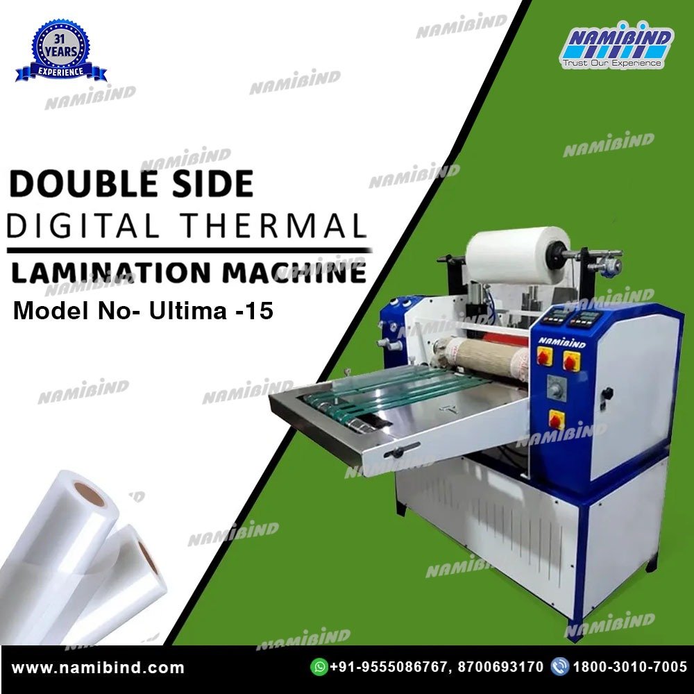 - The better the lamination over the thermal film paper, the better the print quality will be received. Namibind double side thermal lamination machine model no: ultima-15 is best to use in all types of digital printing work. Ultima-15 is completely made from Indian technology, it can be used for 25-micron film to 250-micron film, temperature control system can be set according to film thickness, speed control system can also be set at a given speed in minutes 12/15 mtr can do lamination as per film thickness. This lamination can be used to get single and double-side lamination as well.