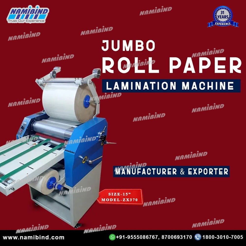 Jumbo Roll Thermal Lamination Machine Model ZX370 is for volume commercial lamination work This model is the most commonly used model for those who have volume lamination work It may take a jumbo roll and may fit up to 1000 meter rolls its laminating speed is 12/13 is Meter Per Minute. It also has Speed Control and Temperature Control features. in printing industries. bookbinding center. photo album making. library .school .collage. educational institute in every commercial center with volume lamination. You can continue lamination by applying the roll once in ZX370, there is no need to change the lamination roll again and again.